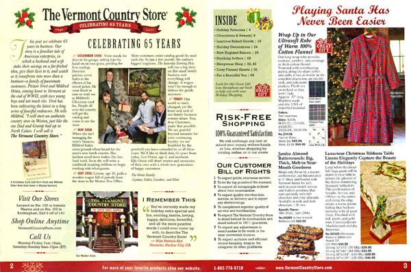 In keeping with Vermont Country Store traditional and time-tested appearance this issue uses catalog principles such as: Keeping the hero product in the upper right hand of spread. Spread headlines and website teasers to draw customer to website to see more.
