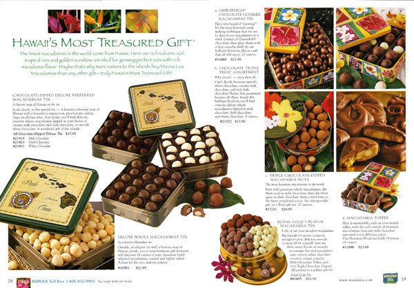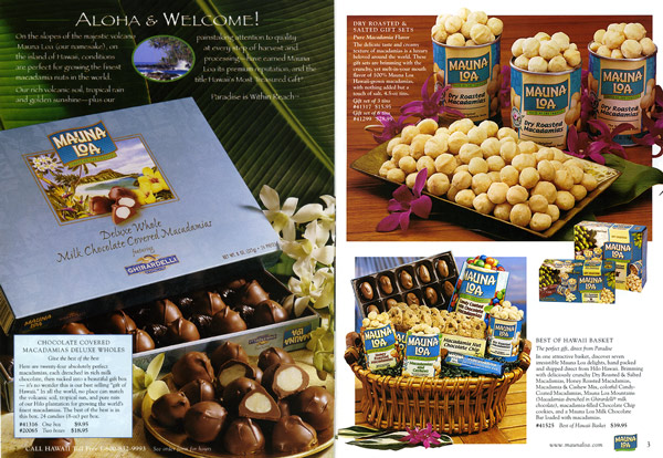 Tropical colors and imagery transport you to the islands where the Manua Loa brand is legendary. Editorial highlights add value and create sub-sections in catalog.